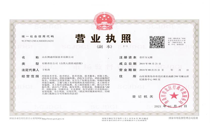 山東博通環(huán)保技術有限公司是一家專業(yè)從事環(huán)保、安全、消防的多元化技術服務公司,公司致力于打造專業(yè)的技術服務團隊,立足青島,輻射山東,服務范圍涵蓋:環(huán)保技術開發(fā)、技術轉讓、技術咨詢、技術服務;環(huán)保工程;消防技術咨詢;消防設施檢測;消防安全評估;消防設施維護保養(yǎng);環(huán)境應急預案咨詢;安全生產標準化咨詢;場地環(huán)境調查報告編制,土壤與地下水環(huán)境調查及風險評估,水土保持方案編制,水土保持過程監(jiān)測,水土保持驗收工程,排污許可申報代理,清潔生產審核;批發(fā)零售:環(huán)保設備、機械設備與配件、消防設備、儀器儀表、五金建材、化學試劑(不含危險品)。公司具有“建設手續(xù)一站式辦理,安環(huán)問題一條龍解決”的獨特優(yōu)勢,可為客戶提供高效、優(yōu)質的安全、環(huán)保、消防管家技術服務。